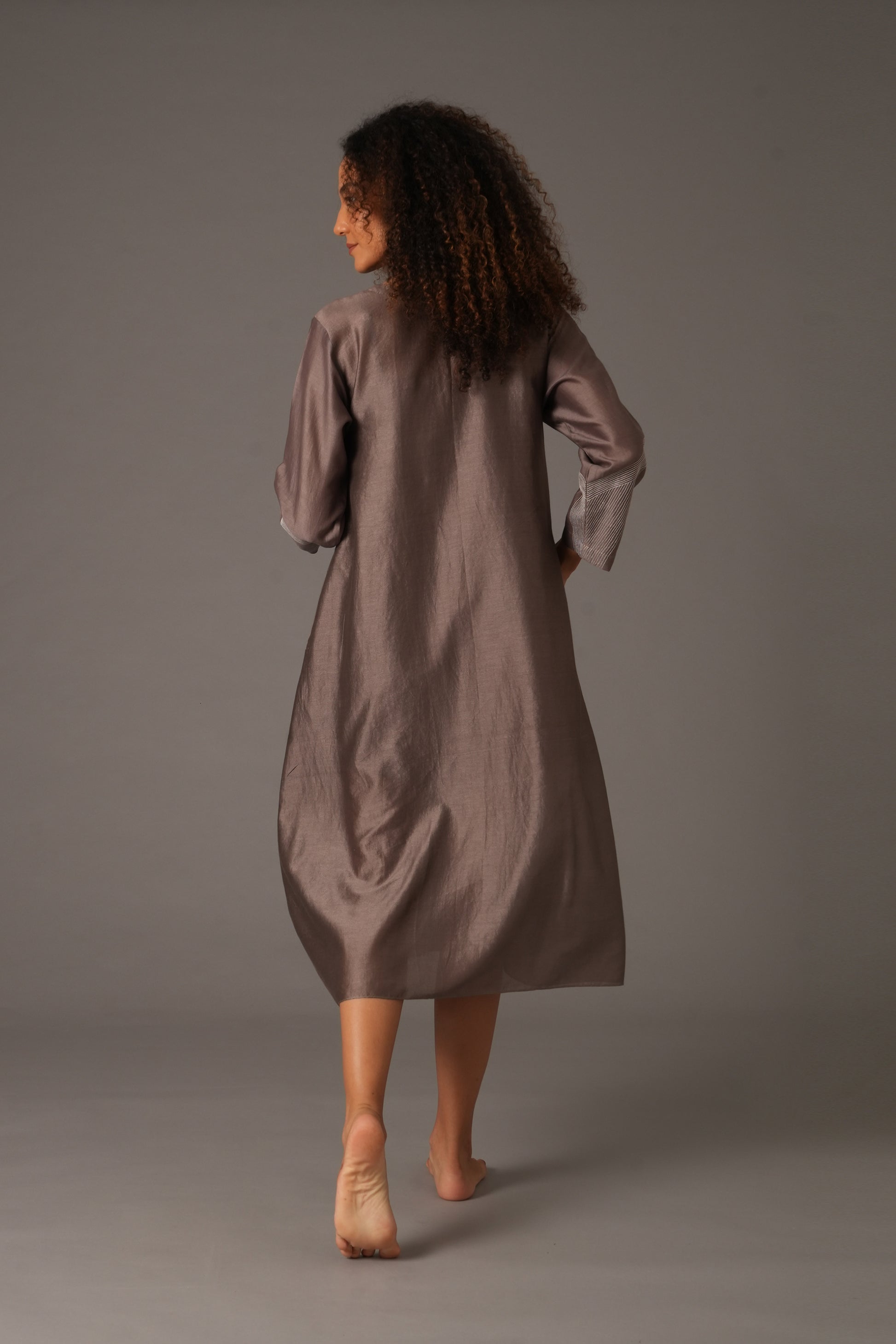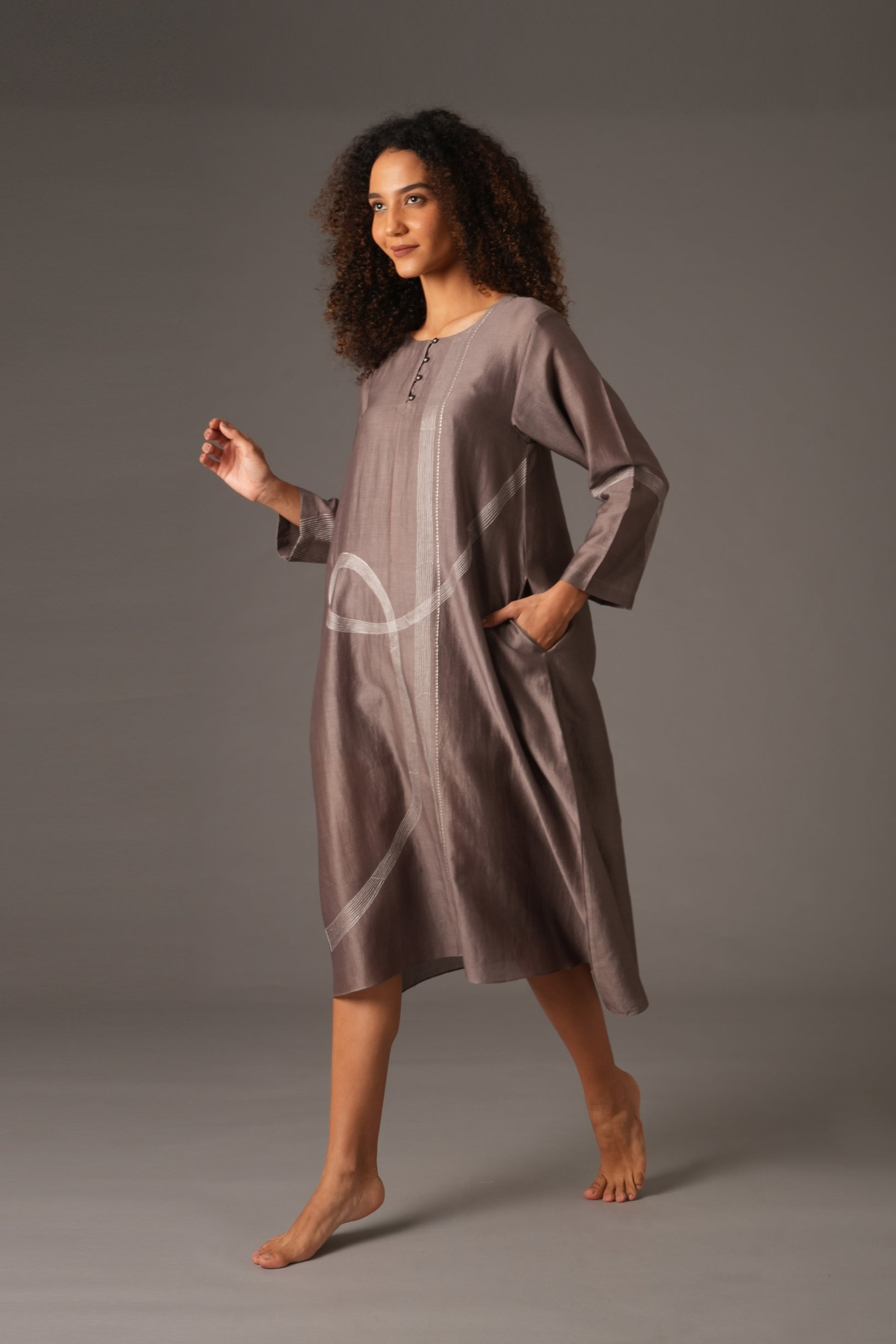 This exquisiteChanderi Silk Dressin aGerigecolor is designed withfull front embroideryfor a sophisticated, stylish look. Theloose fitandround neckadd to its comfort, making it ideal for both casual and semi-formal occasions.