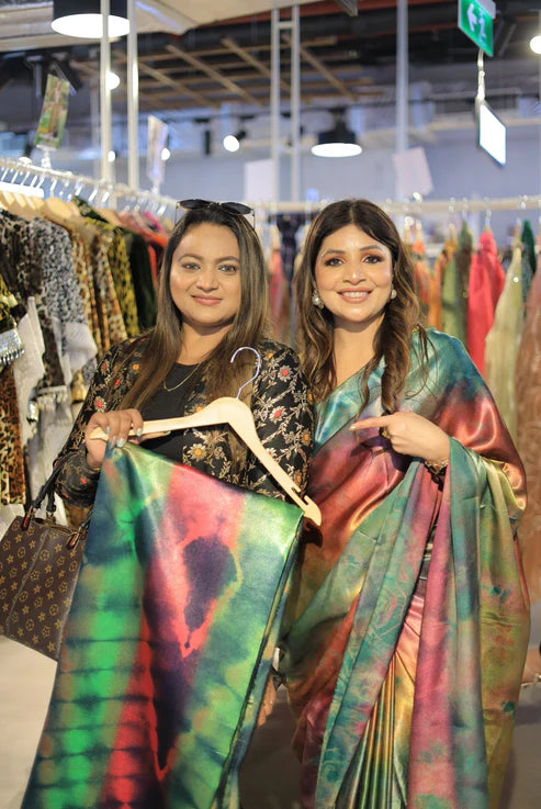 Step into radiant glamour with Ricky Tasha’s Nocturne Prism Luxe Satin Saree, designed for women who love bold luxury with a cosmic edge. Drenched in luminous multicolour hues with an iridescent finish, this saree reflects light beautifully, creating a mesmerizing, high-impact look from every angle.